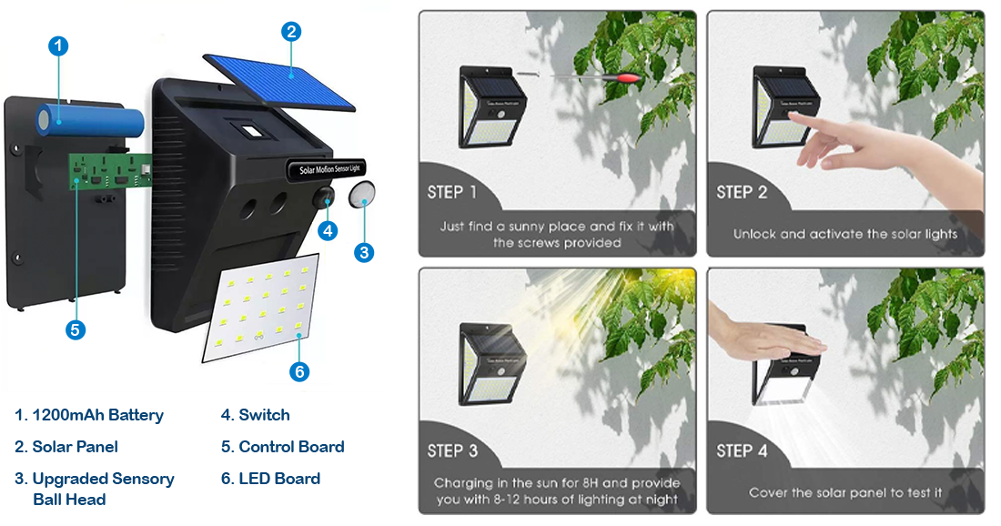 The SolarLite is quipped with 20 super bright LED lights, 400 lumens, 120-degree-angle detection range. During the day, the solar panel converts solar power into electricity and store in the rechargeable battery.
